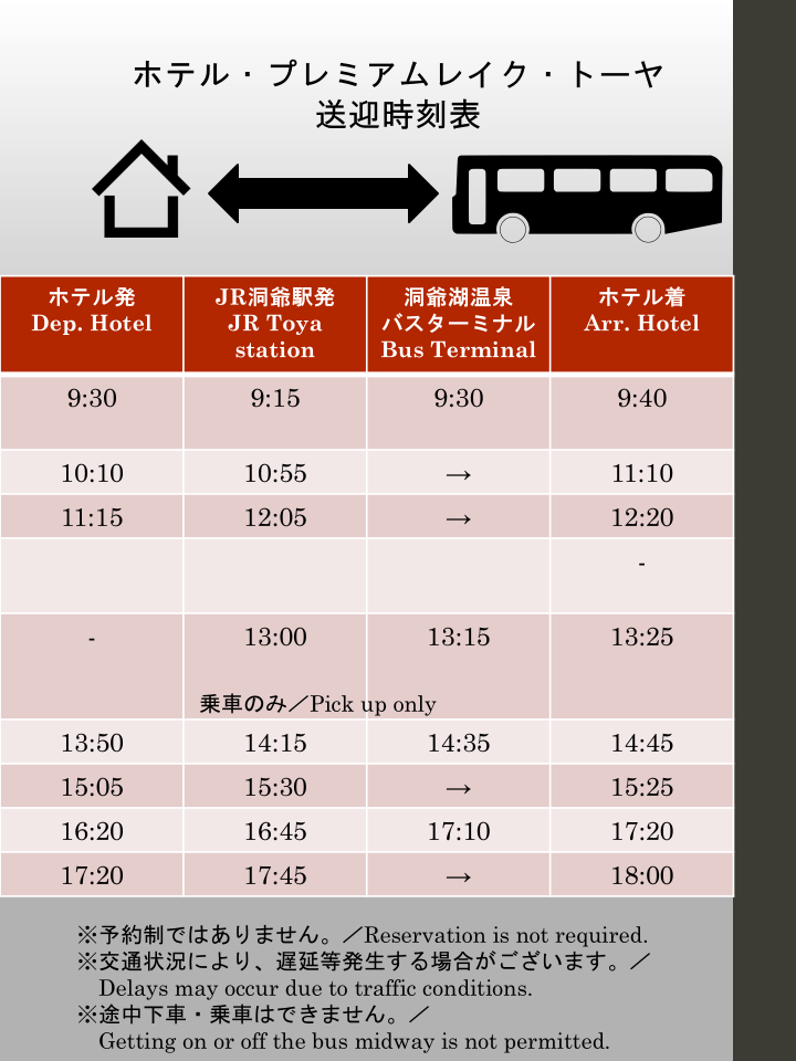 - 無料送迎バス(JR洞爺駅まで)の利用をご希望の方は、ご予約時にお申し付けください。